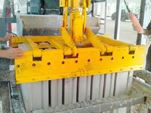 在混合机内通过搅拌器的强烈搅拌使各组分均匀混合后,由液压翻转装置将料浆自动倒入成型机的各个模腔中。在料浆凝固的某个适当阶段,驱动装在模腔上方的液压成型刮刀,使之往返运动,以刮出各砌块的上部企口。然后中央液压站驱动成型机的顶升系统,将整排石膏砌块从模具中顶出。此时位于成型机上方的气动伸缩夹具将整排砌块夹住、提升、移出,放在垛架或小车上。然后由叉车运送至自然干燥场地干燥,或由小车将砌块垛送入隧道窑内进行人工干燥。干燥完毕的石膏砌块经过检验合格后,即可运输、包装作成品贮存或装车外运。